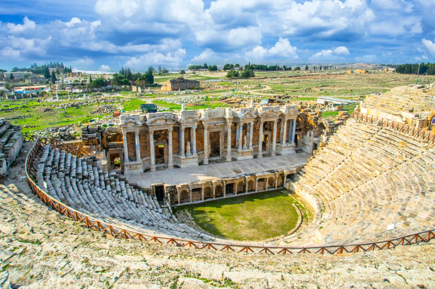 Heritage Site of Pamukkale. Also known as Cotton Castle in Turkish, this natural wonder is a sight to behold. The rock formations contain hot springs with terraces of carbonate minerals that are relaxing to bathe in. If you wish, take a dip in one of its many pools, or just admire them and stay dry. From Pamukkale, continue on to the ancient city of Hierapolis where you will visit the Roman Amphitheatre, Odeion theater, Delphinum, the Necropolis and Cleopatra pool (own expense). Then have lunch at a local restaurant and enjoy a display of locally handcrafted ONYX goods before transfer to your hotel where you will have the evening at leisure. Overnight stay in Kusadasi.