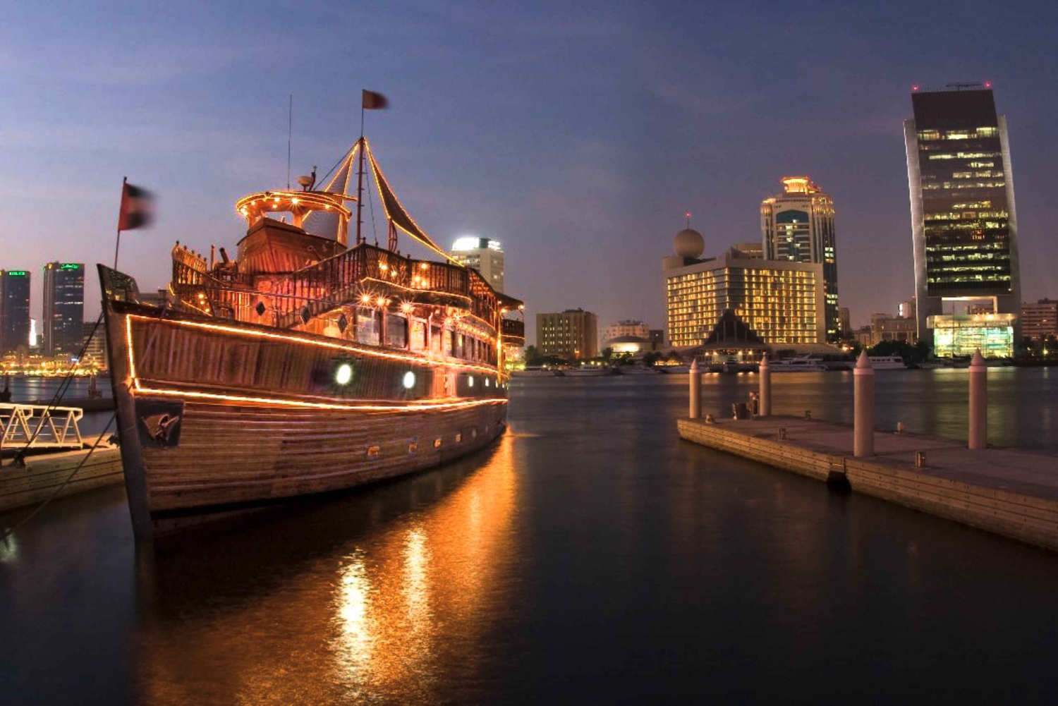 In the evening, enjoy a dinner cruise on a wonderful wooden dhow, built with every comfort in mind, and a romantic way of spending an evening in Dubai. Start the evening with a transfer from your hotel to the cruise hassle free. Experience an unforgettable evening in opulent surroundings combined with Arabic traditions. Savor a sumptuous feast of Arabic and international cuisine as you sail past the illuminated buildings of Dubai. On this 3-hour cruise along moonlit Dubai Creek you’ll take in views of the brilliantly-illuminated skyline. Relax as you enjoy the live music and entertainment. The international buffet dinner features a selection of local delicacies. At the end of the cruise you’ll be dropped off back